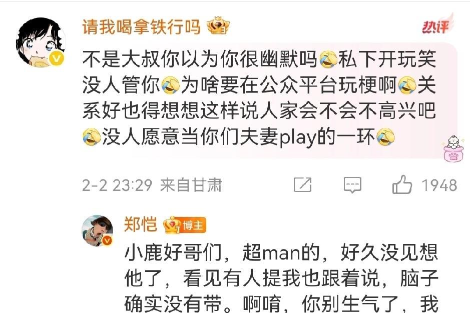 他有2800万粉丝,发个评论跟发条新闻差不多。可那句“鹿晗”,根本不是对着朋友说的,是甩给几百万陌生人看的。 朋友之间叫老婆“鹿晗”可能图个乐,但放到公开平台,等于把私人玩笑直接倒进大喇叭里。没人问你熟不熟,只看见一个男人用另一个男明星的名字指代自己的妻子。